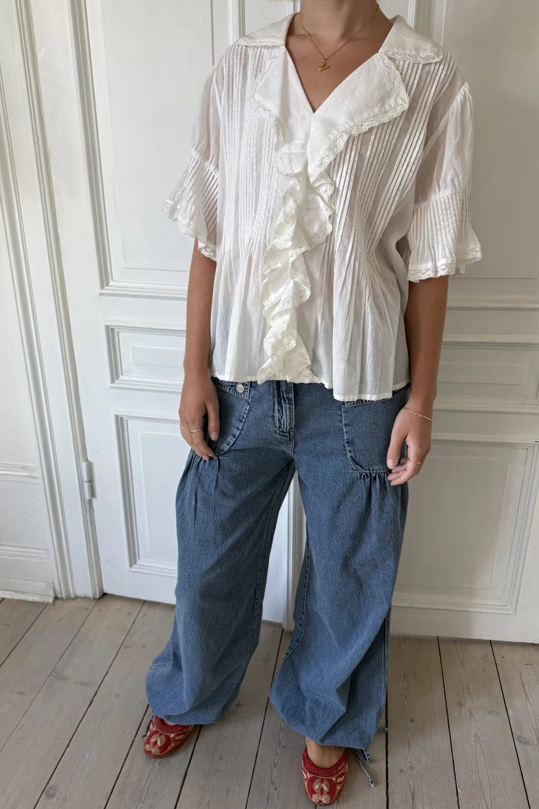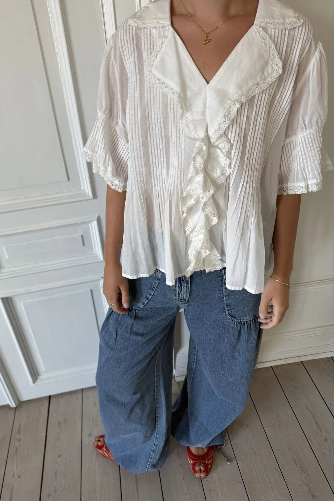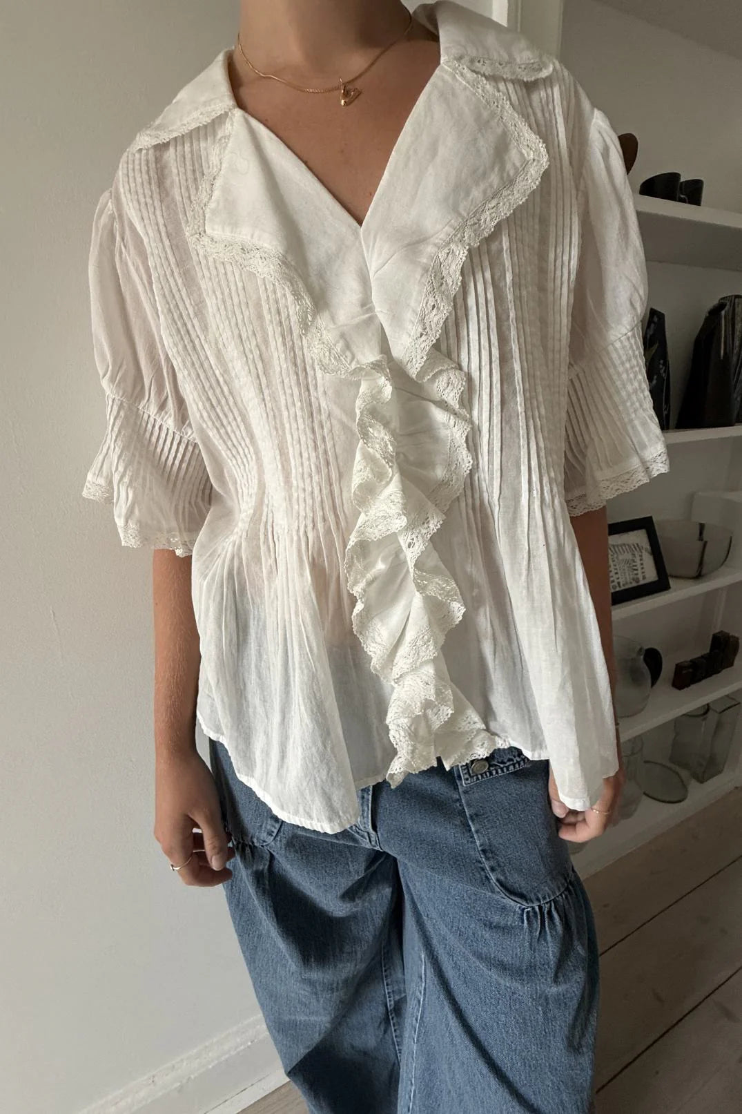 Made in soft organic cotton voile, the shirt is designed with a wide collar, flared sleeves, and ruffled edges at front. The silhouette is light and effortless, with lace trim details that add a romantic touch. Pair with denim for contrast or wear with a flowy skirt for a softer expression.