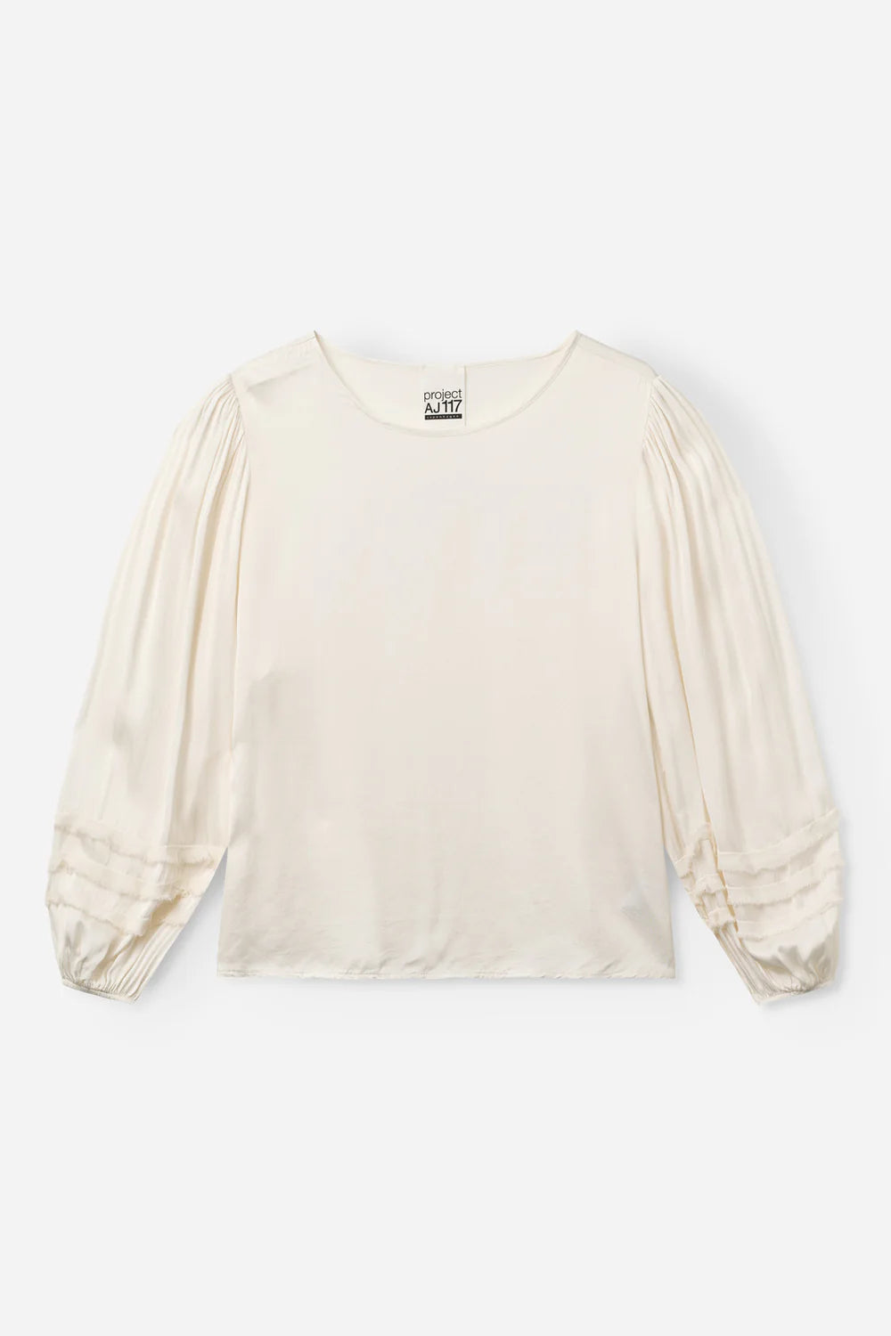 REBEKKA is a soft and feminine blouse with rounded neckline and straight hem. The long sleeves are gathered at the shoulders and finished with layered fabric trims that add subtle volume and texture.
