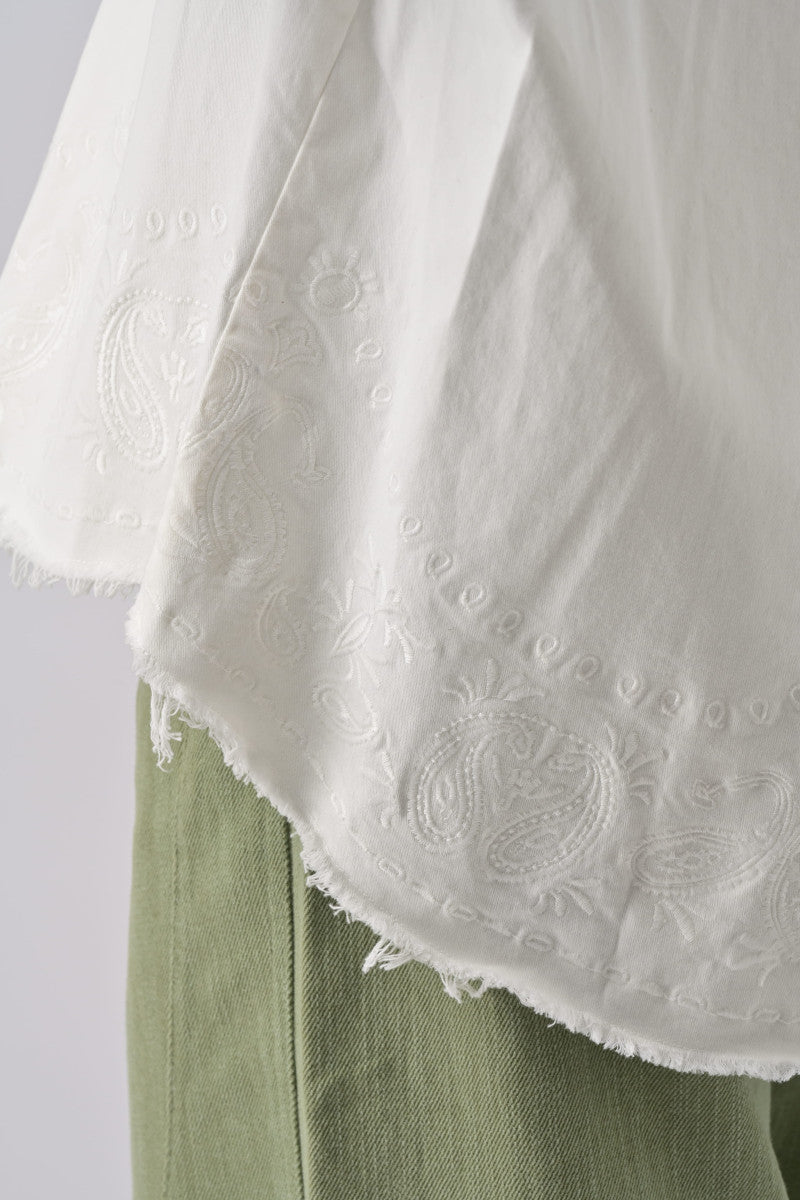 The Aglaé jacket seduces with its casual look and elaborate details. Its straight and slightly oversized cut makes it an easy piece to wear on a daily basis, ideal for overlays on a top or a light sweater. Made of a flexible canvas, it offers a natural and comfortable fall. Its signature detail is revealed at the bottom of the piece, with a delicate embroidery that brings a feminine and subtly bohemian touch. The chest pocket and tone-on-tone buttons reinforce its utilitarian spirit, balanced by the fineness of the finishes.