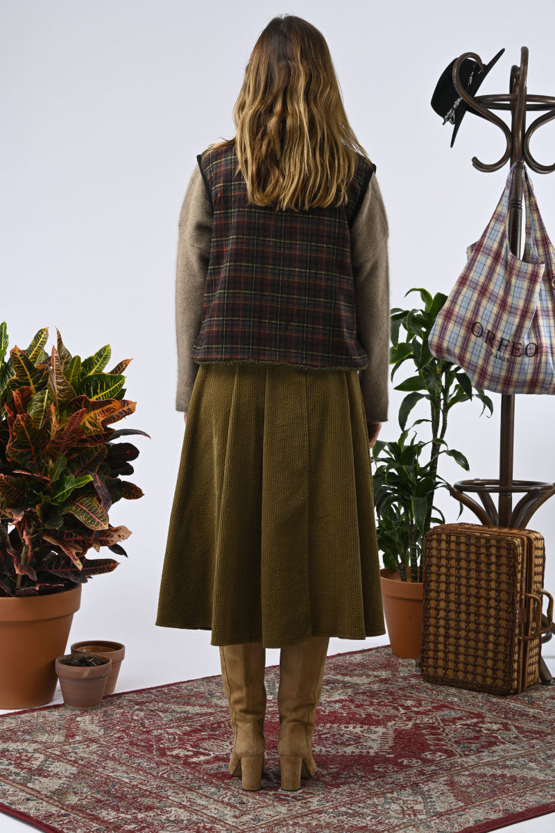 Doli sleeveless wool vest with a front zip closure. Its check pattern gives it a graphic and timeless character. Available in khaki and carbon checks.