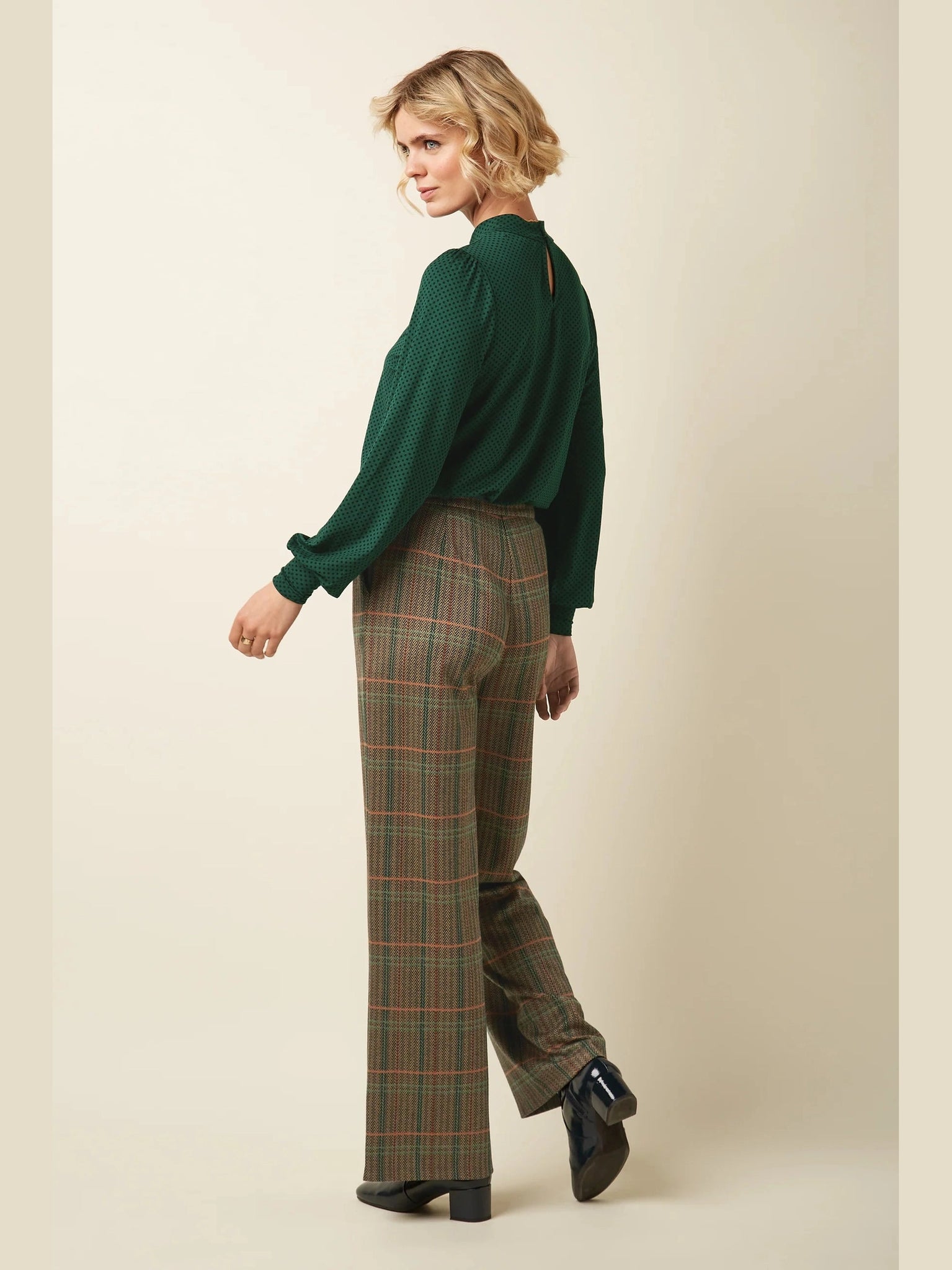 Ethel Pants Luton offer a fitted fit with straight legs for a sleek silhouette. Featuring a mid waist, slanted pockets, and a zip and hook closure, these stretch jersey pants showcase a stylish checkered print, combining comfort and sophistication for any occasion.