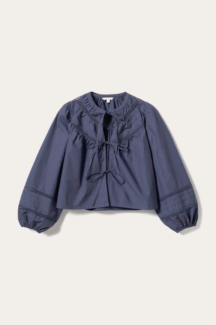 The N-Marceline Blouse is a long-sleeve blouse with a back cutline and balloon sleeves. It opens fully at the front and is secured with tie strings, creating a light, detailed look. The blouse features a round neckline and delicate lace detailing around the collar and sleeves.
