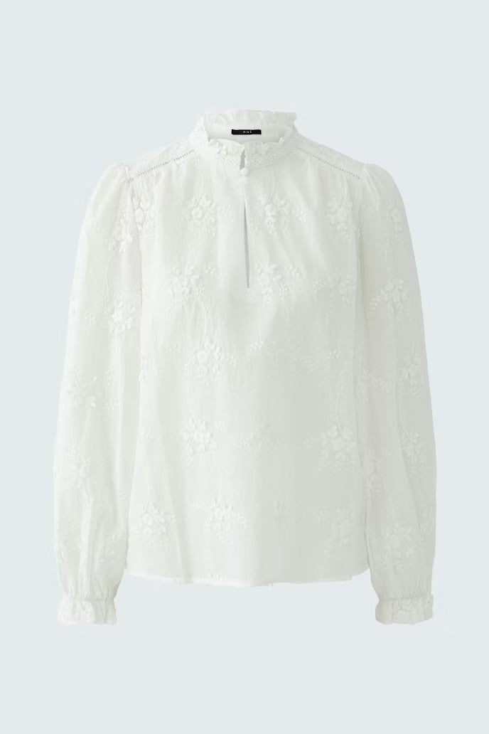 - Short ruffle edge at the round neck with a small button closure, can also be worn open as a V-neck