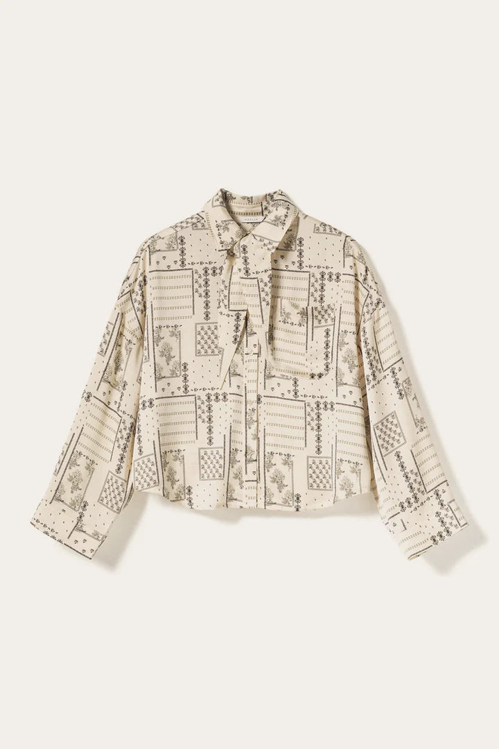 N-Lirinnah Shirt features an eye-catching print and a classic collar with a delicate neck scarf detail. The shirt has long sleeves.