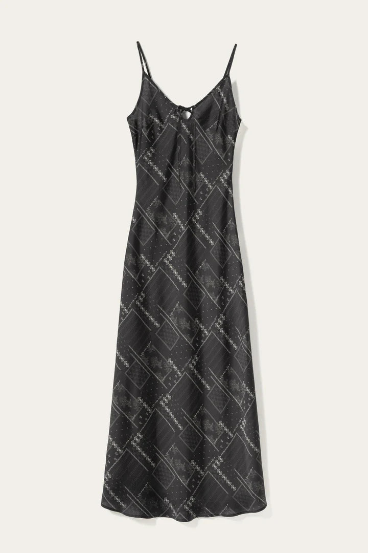 Megan Dress is a strap dress featuring a marked waist for a flattering fit, and a delicate tiestring detail at the center front.